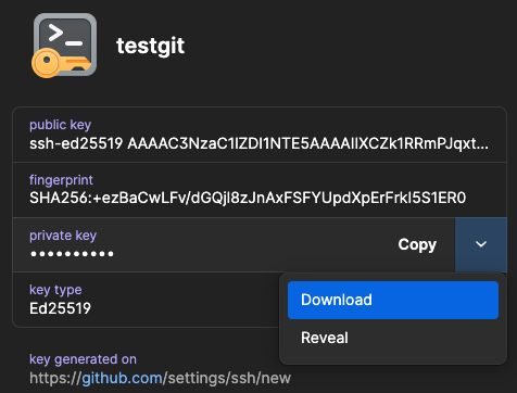 In your 1Password, go to your newly formed ssh key and download the private key.