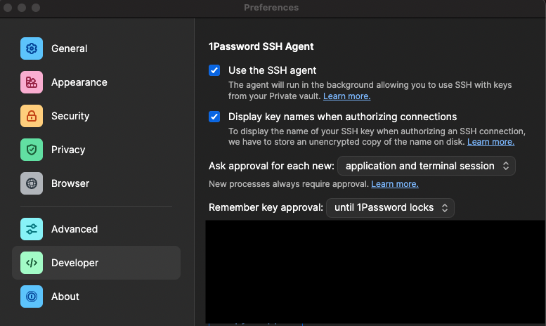 Developer, then check theUse the SSH agentandDisplay key names when authorizing connectionsboxes.
