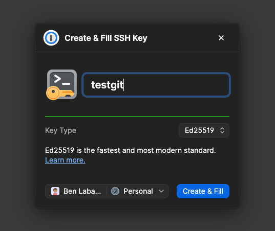 Create SSH Key - In the 1Password prompt, enter a simple, one-word title and select ed25519